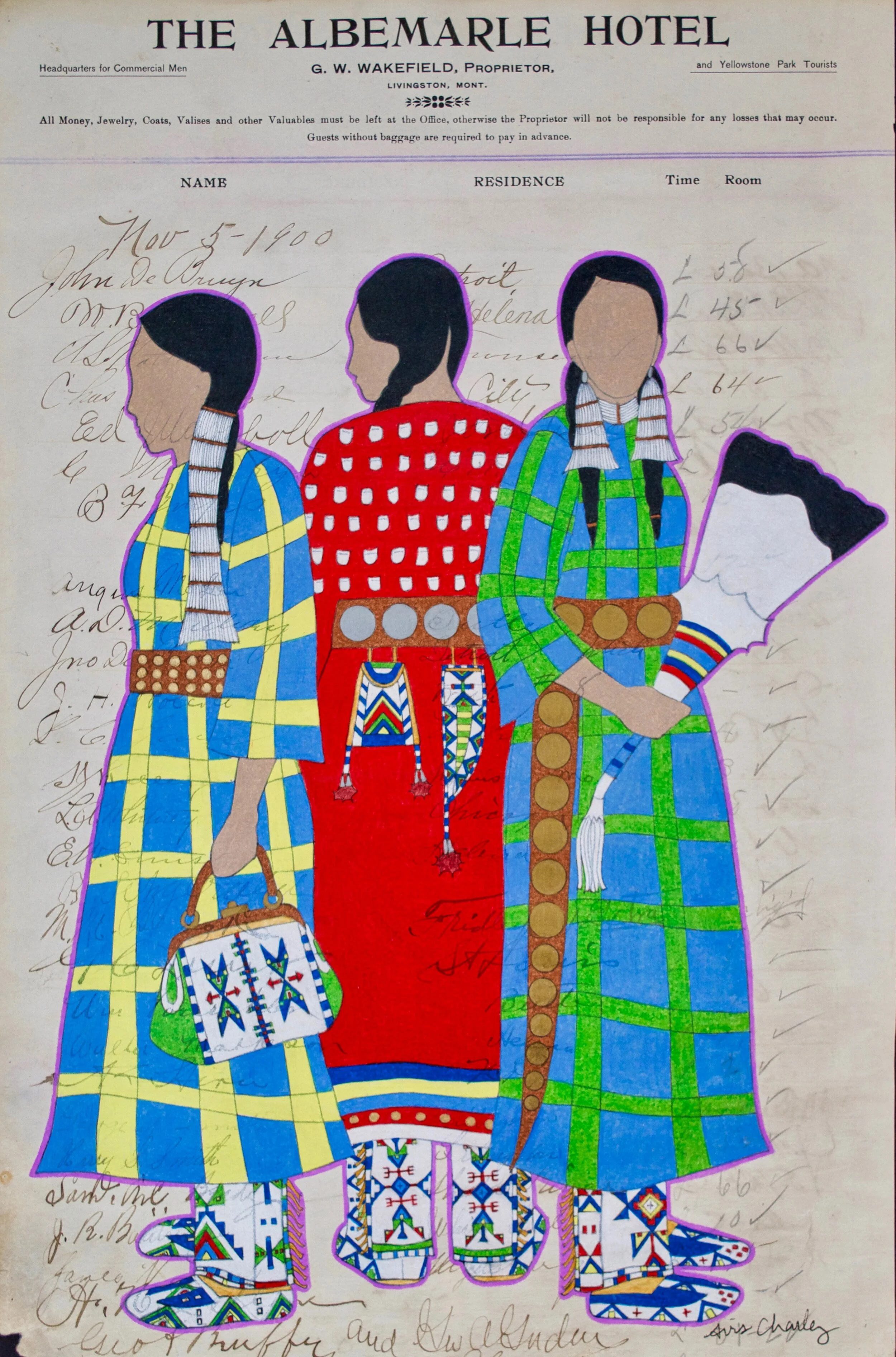 “Ledger Art” began as male prison art - a new medium in a new environment. Color pencils, crayons, and pages from accounting ledger books spoke of the masculine aspects of culture with stories of warring, hunting, and courting scenes by our ancestors.